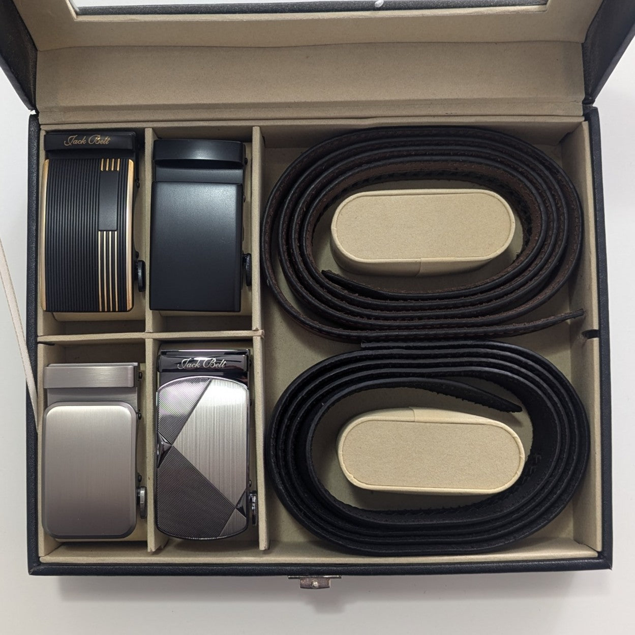 Contains TWO FULL GRAIN LEATHER Jackbelt® and FOUR BELT BUCKLES.